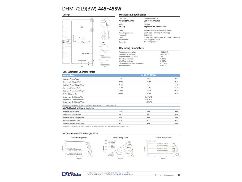 Prémiový monokrystalický FV panel s výkonem 455 Wp, navržený pro vysokou efektivitu, dlouhou životnost a maximální návratnost investice. Vhodný pro síťové i ostrovní systémy, rodinné domy, firemní instalace i velké projekty. DAH Solar DHM-72L9 455 Wp patří mezi nejefektivnější monokrystalické panely s výjimečnou účinností a odolností pro systémy připojené do sítě i pro ohřev vody.